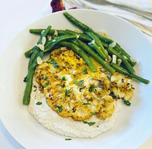 Roasted Cauliflower with Green Beans + Sunflower Seed Purée